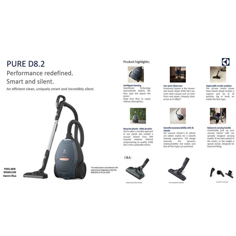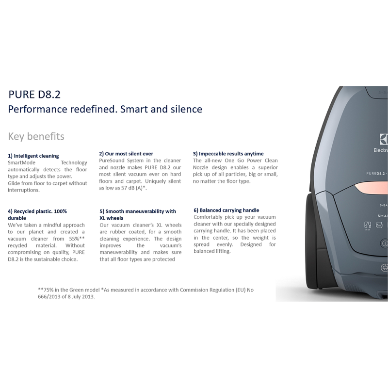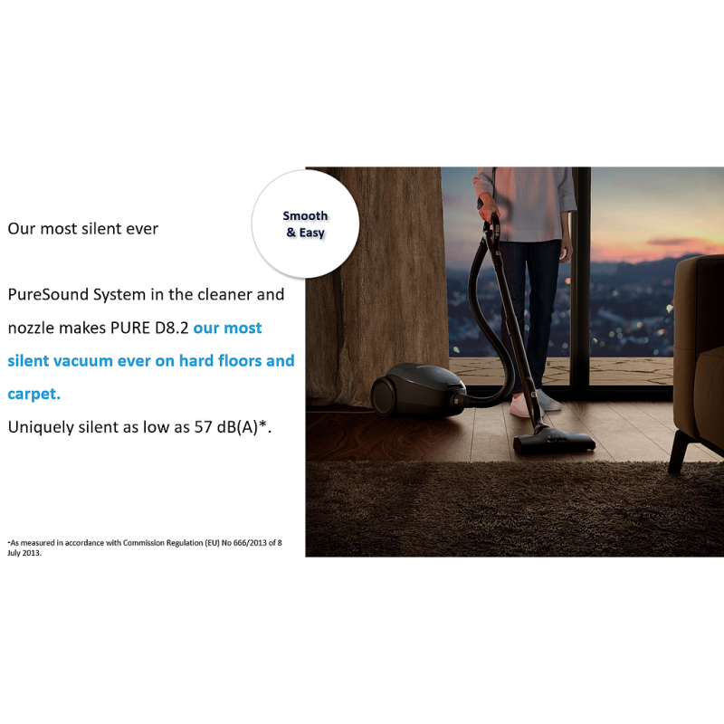 Vacuuming is reimagined with the PURE D8.2. SmartMode technology, the PureSound system and the powerful OneGo cleaning nozzle are designed to deliver efficient cleaning, unique intelligence and incredibly quiet operation.