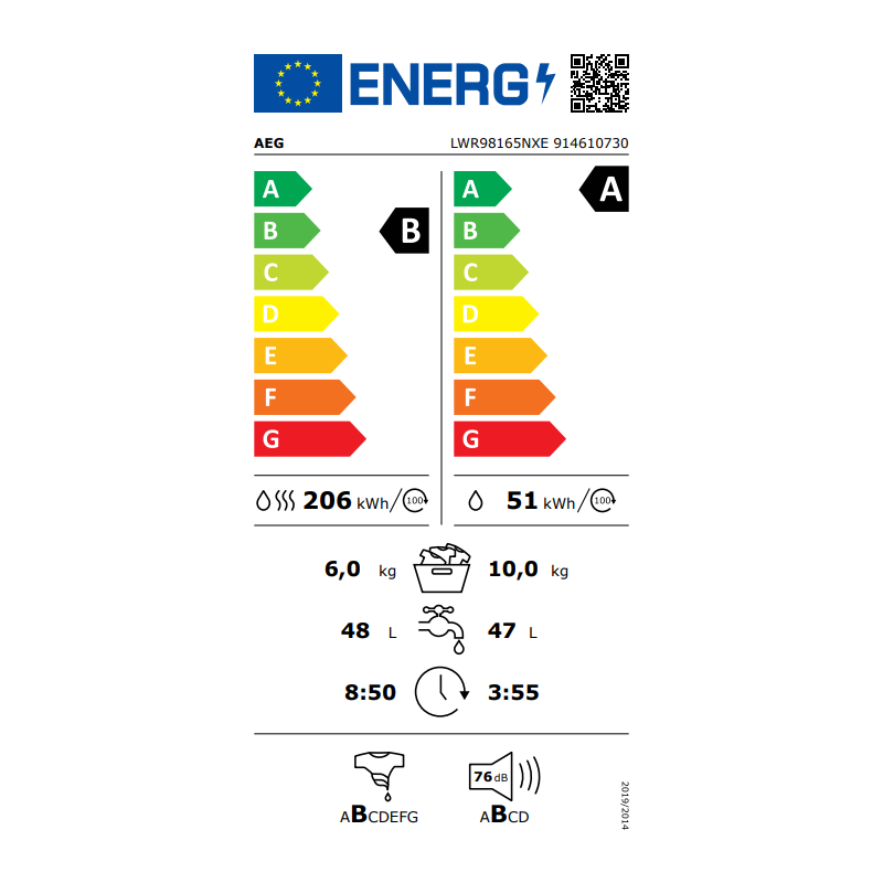 Heat pump technology dries clothes at half the temperature, protecting them from unnecessary heat while reducing energy use by up to 55%. This technology enables B-class energy efficiency in continuous wash & dry cycles.